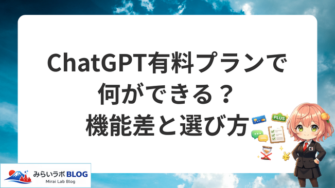 こんにちは!みらいラボのモモです。 ChatGPTは無料でも使えますが、有料にすると「できること」よりも先に体感が変わります。待ち時間や回数制限が気になりにくくなって、長い文章や複数の資料を扱う作業が続けやすくなります。 この記事では、有料プラン... -