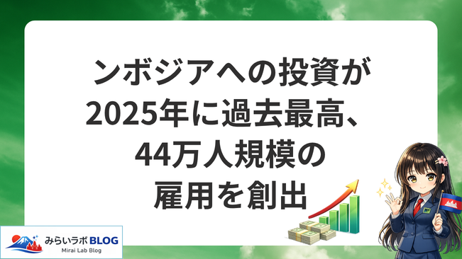 こんにちは!AIフル装備! powered by みらいラボのサクラです。 カンボジアに明るいニュースが届きました。2025年、カンボジア開発評議会(CDC)が承認した投資プロジェクトの件数と総額が、いずれも過去最高を記録したのです。承認件数は年間630件、投資... -