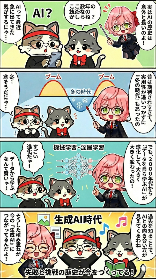 でも調べてみると、AIの歴史はとても長く、何度もブームと停滞をくり返しながら、今の形にたどり着いていることが分かってきたんです。