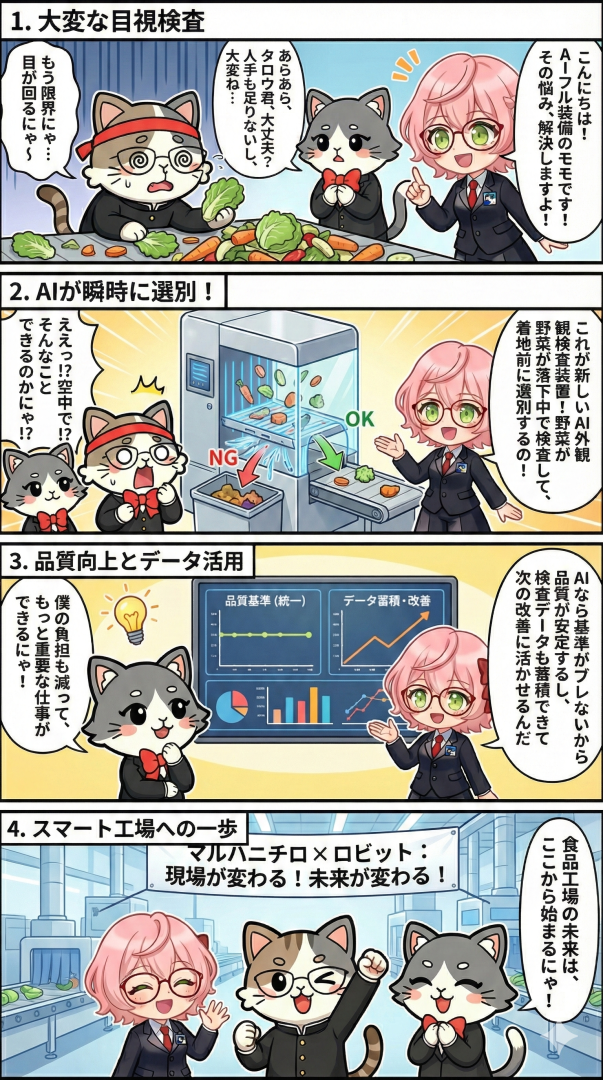 今回のポイントは、マルハニチロとロビットが共同で、カット野菜の検査工程を自動化するAI検査装置を開発し、工場で導入を進めた点です。