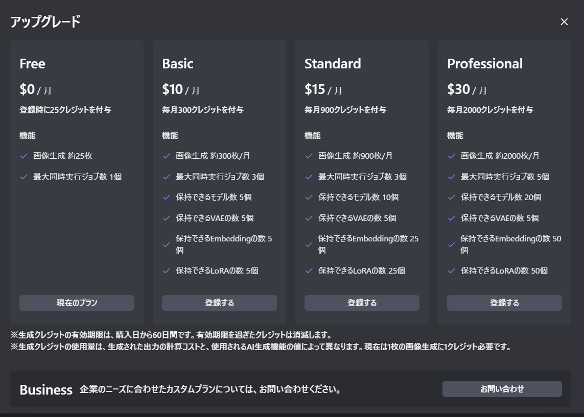 新規登録者には25クレジットが提供されますが、無料プランではクレジットの自動リセットや追加はありませんので、サービスを継続して利用するには有料プランへのアップグレードが必要です。有料プランにすることで定期的なクレジット補充があり、利用頻度やニーズに応じたプラン選択が可能です。無料プランは限定的な利用向けで、継続的な使用、気に入った方には有料プランがおすすめです。