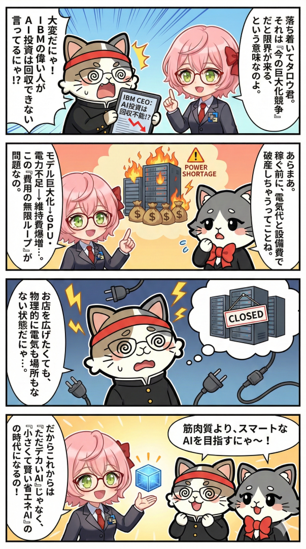 今回のIBM CEOの発言から見えてきたのは、AI技術の進化そのものよりも、それを支えるインフラの持続可能性が限界に近づいている という現実でした。