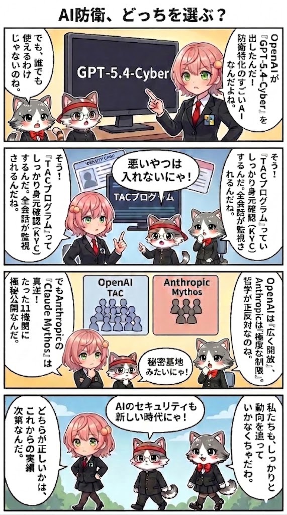 このニュースが重要な理由は、「AIをどこまで開放するか」という問いに対して、業界を代表する2社が正反対の答えを示したからです。Anthropicの超限定公開とOpenAIの広い開放という対比は、AIの安全と有用性のバランスをめぐる根本的な哲学の違いを体現しています。この議論の行方は、今後のAI安全政策や規制の議論にも大きな影響を与えます。