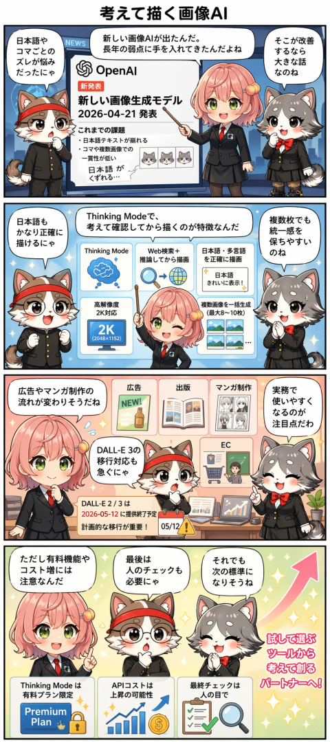 OpenAIが2026年4月21日に発表した「ChatGPT Images 2.0」(gpt-image-2)は、画像生成前に推論・Web検索・自己検証を行う「Thinking Mode」、多言語テキストの約99%精度での描画、2K解像度での一括生成(最大8〜10枚)という3つの大きな進化を持っています。従来モデルであったDALL-E 2とDALL-E 3は2026年5月12日に廃止される予定で、画像生成のデフォルトモデルが世代交代します。