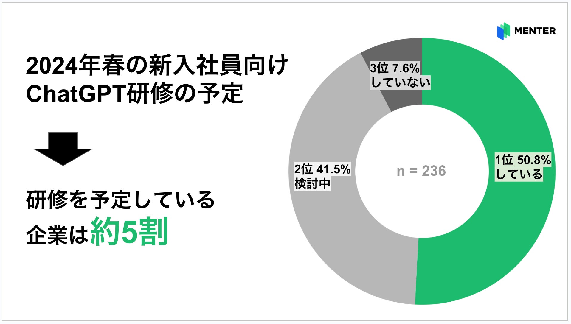この調査によると、2024年春の新入社員向けに「ChatGPT」研修を予定している企業は約50.8%に上り、「検討中」は41.5%となっています。