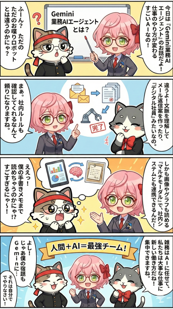 今日は、最近ニュースでもよく見かける「Geminiを活用した業務AIエージェント」について、どなたでもイメージしやすいように、できるだけ丁寧に解説していきます。